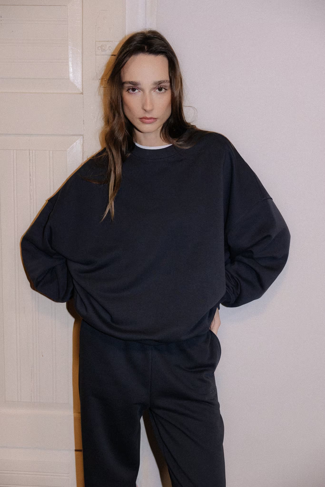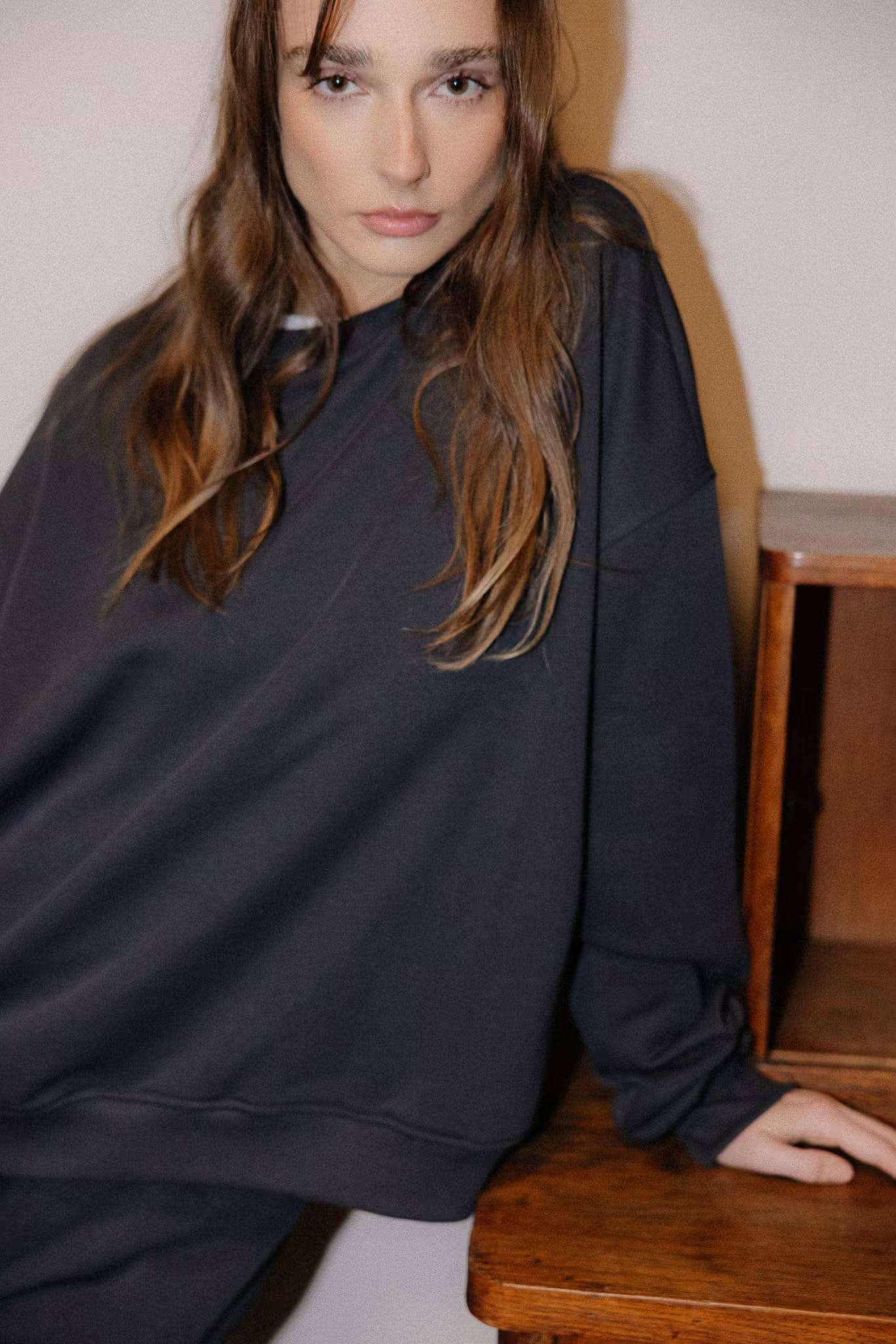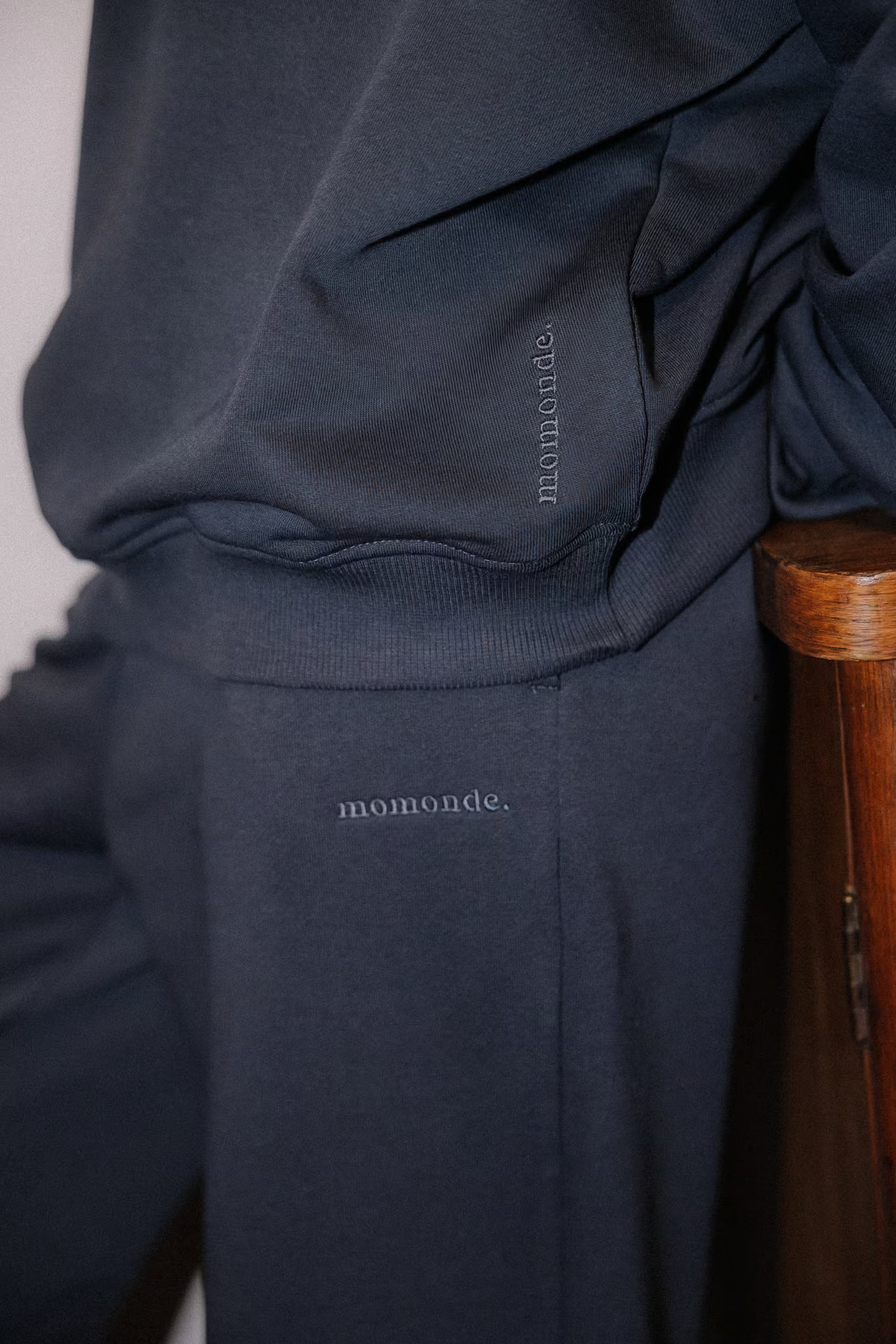 An oversized sweatshirt with a standard length, dropped shoulders, and elongated sleeves. Finished with ribbed cuffs, hem, and placket, and detailed with an embroidered momonde logo. Designed to pair seamlessly with our Rosie and Poppy trousers.