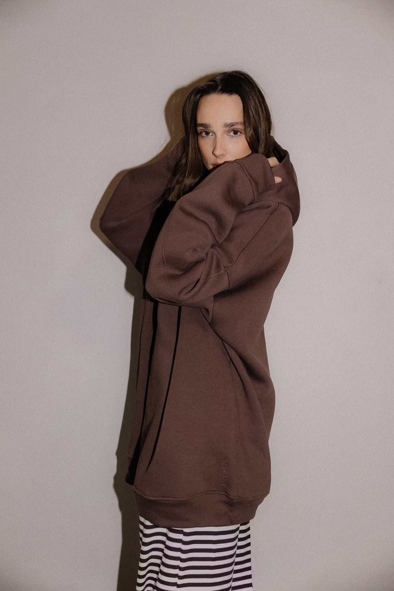 The hoodie is made from high-quality brushed cotton with an elevated weight, making it exceptionally soft, warm, and pleasant to the touch. The certified fabric, produced in Poland, stands out for its durability and resilience. It combines premium cotton with polyester to ensure structure and stability – especially important with an oversized silhouette. The material resists pilling, stretching, and fading, and maintains its original shape.