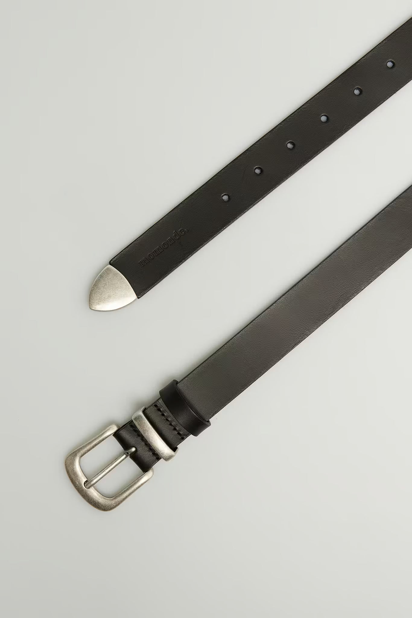 Skóra naturalna garbowana roślinne. Matalowa klamra. Metalowa końcówka. Tłoczone logo momonde. Regulowana długość.