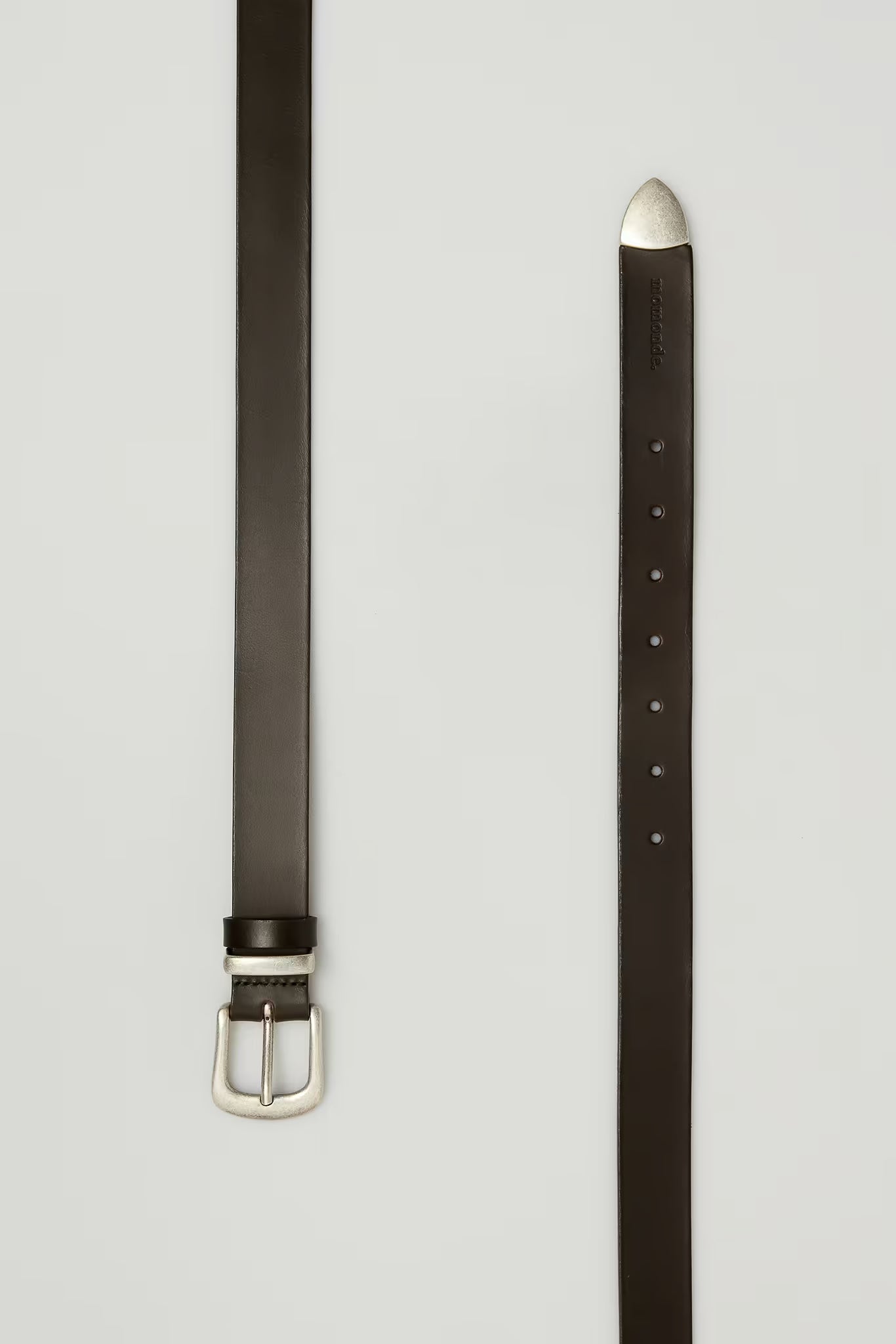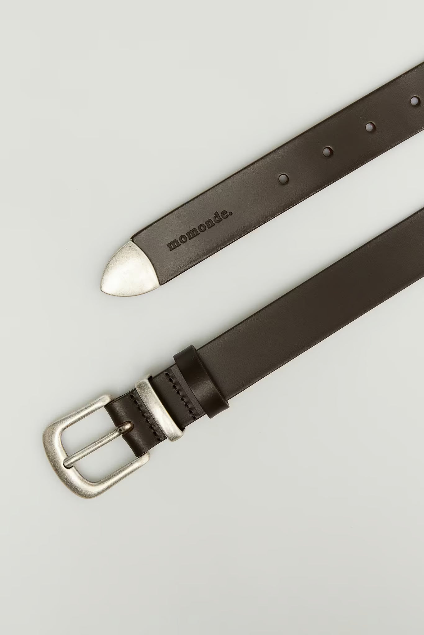Skóra naturalna garbowana roślinne. Matalowa klamra. Metalowa końcówka. Tłoczone logo momonde. Regulowana długość.