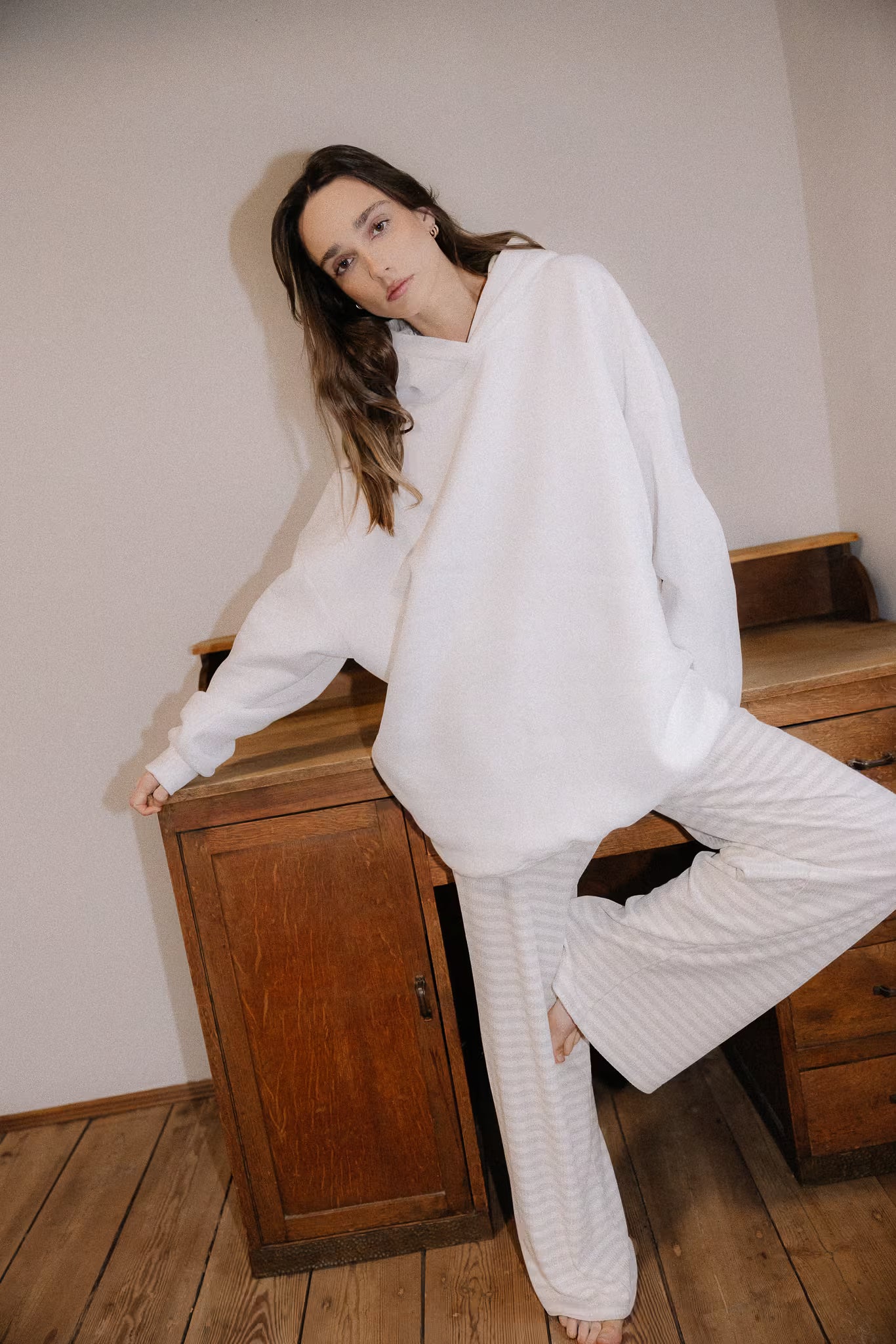 The hoodie is made from high-quality brushed cotton with an elevated weight, making it exceptionally soft, warm, and pleasant to the touch. The certified fabric, produced in Poland, stands out for its durability and resilience. It combines premium cotton with polyester to ensure structure and stability – especially important with an oversized silhouette. The material resists pilling, stretching, and fading, and maintains its original shape.