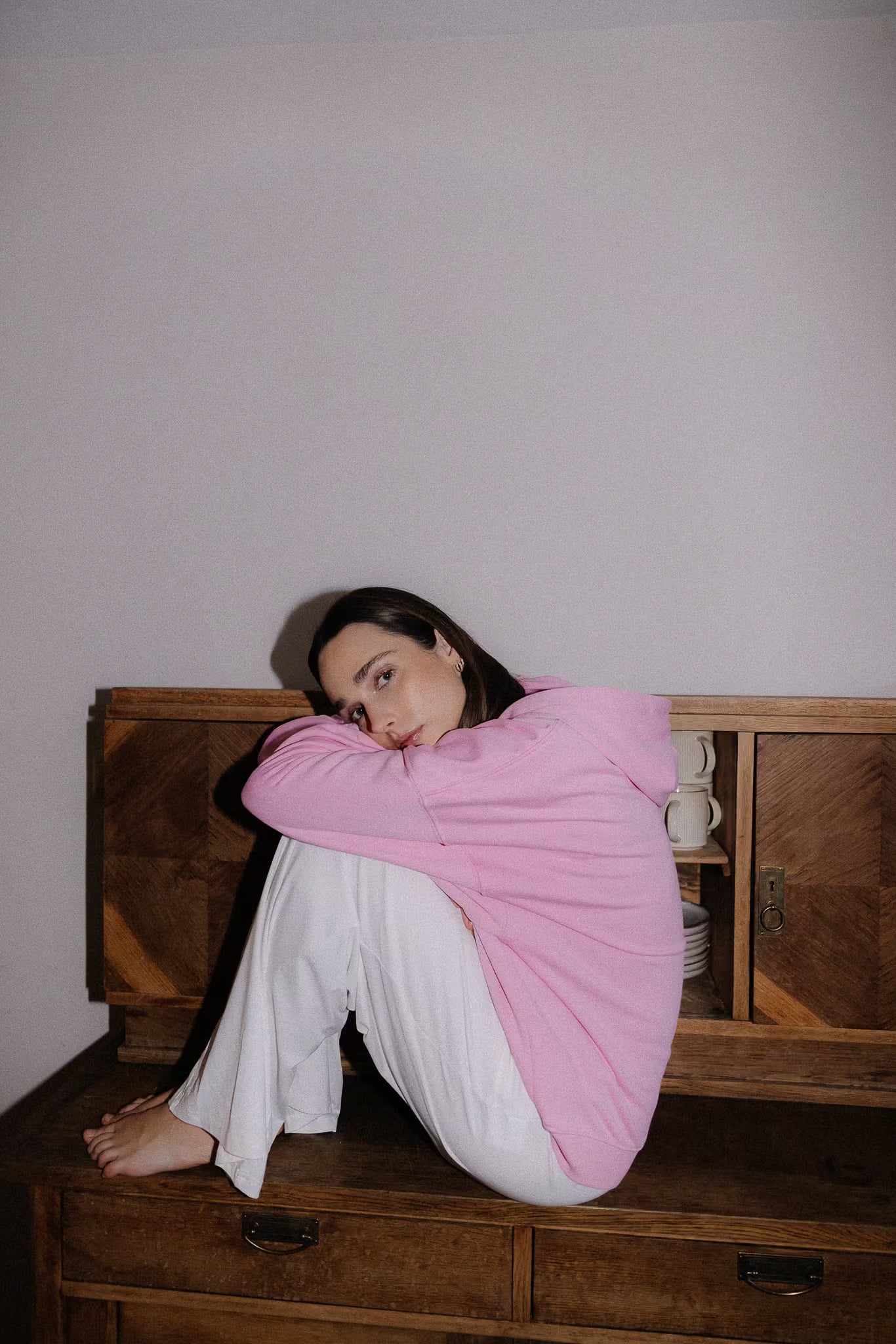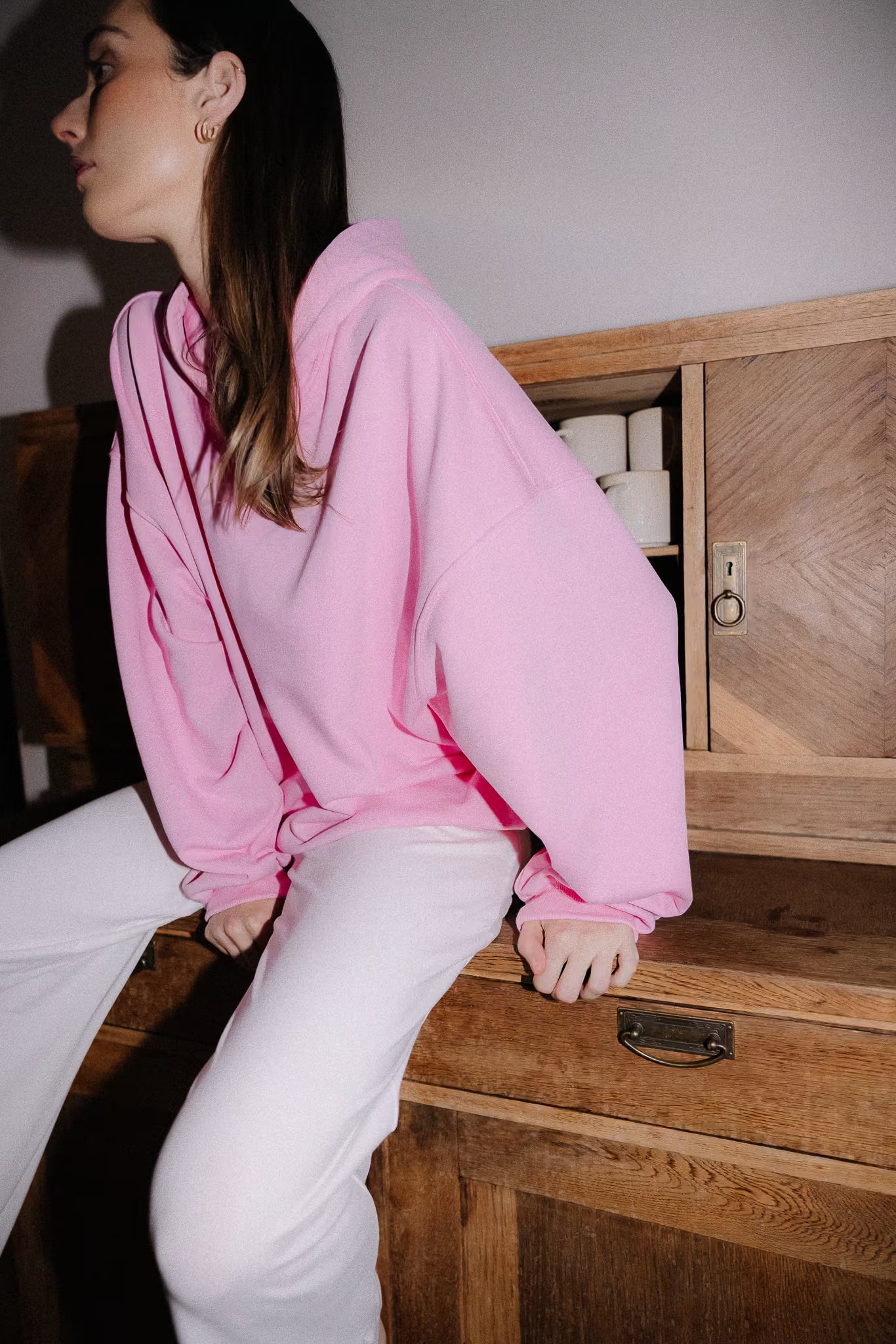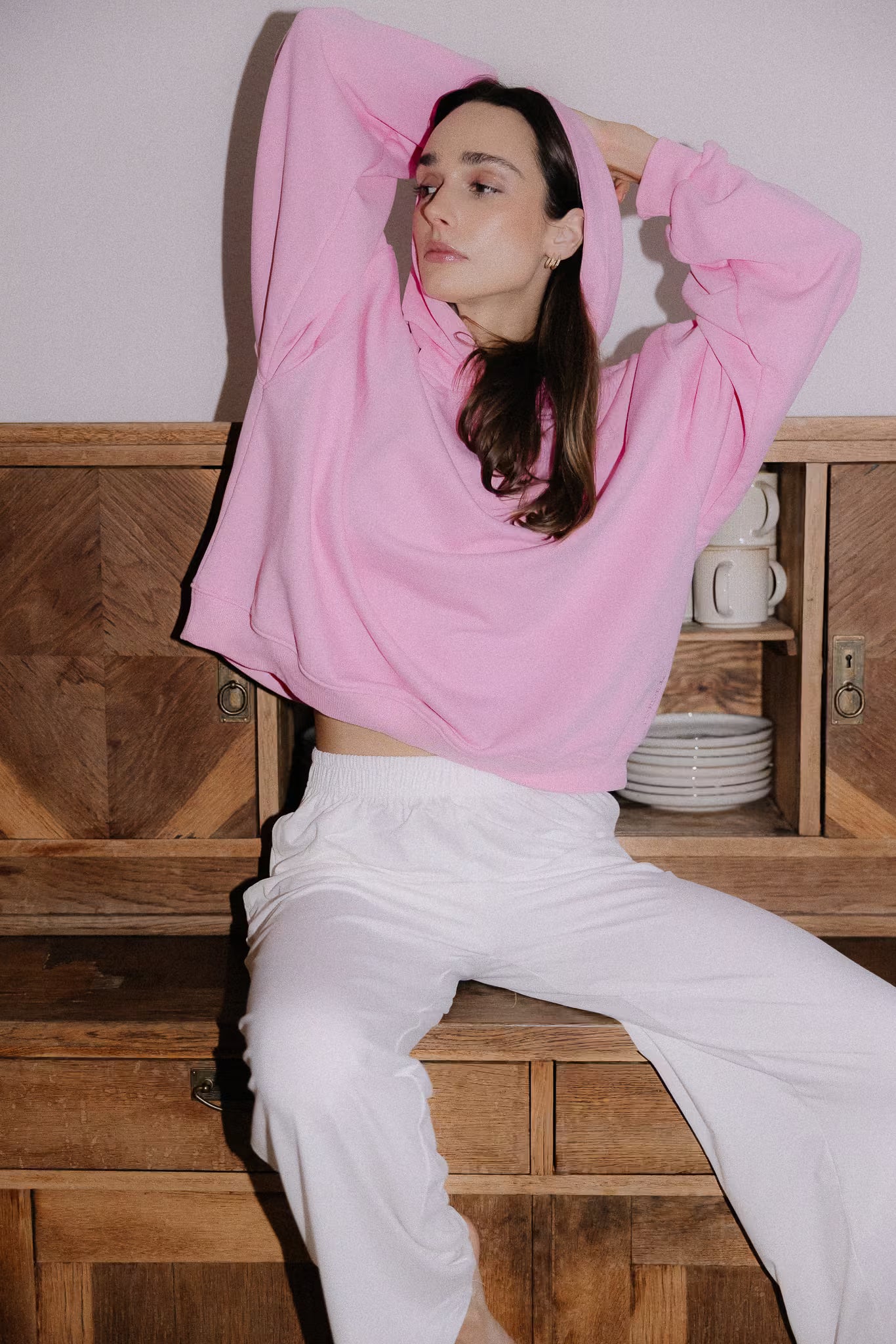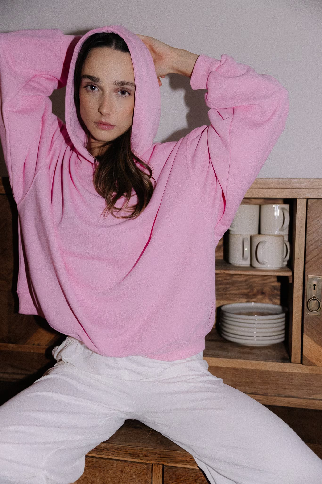 Bluza z kapturem o szerokim kroju i standardowej długości z obniżoną linią ramion, szerokimi i długimi rękawami. Mankiety oraz dół bluzy wykonane z prążkowanego ściągacza. Bluza wykończona haftowanym logo momonde. Zaprojektowana tak, aby tworzyć doskonałe połączenie z naszymi spodniami Poppy i Rosie.