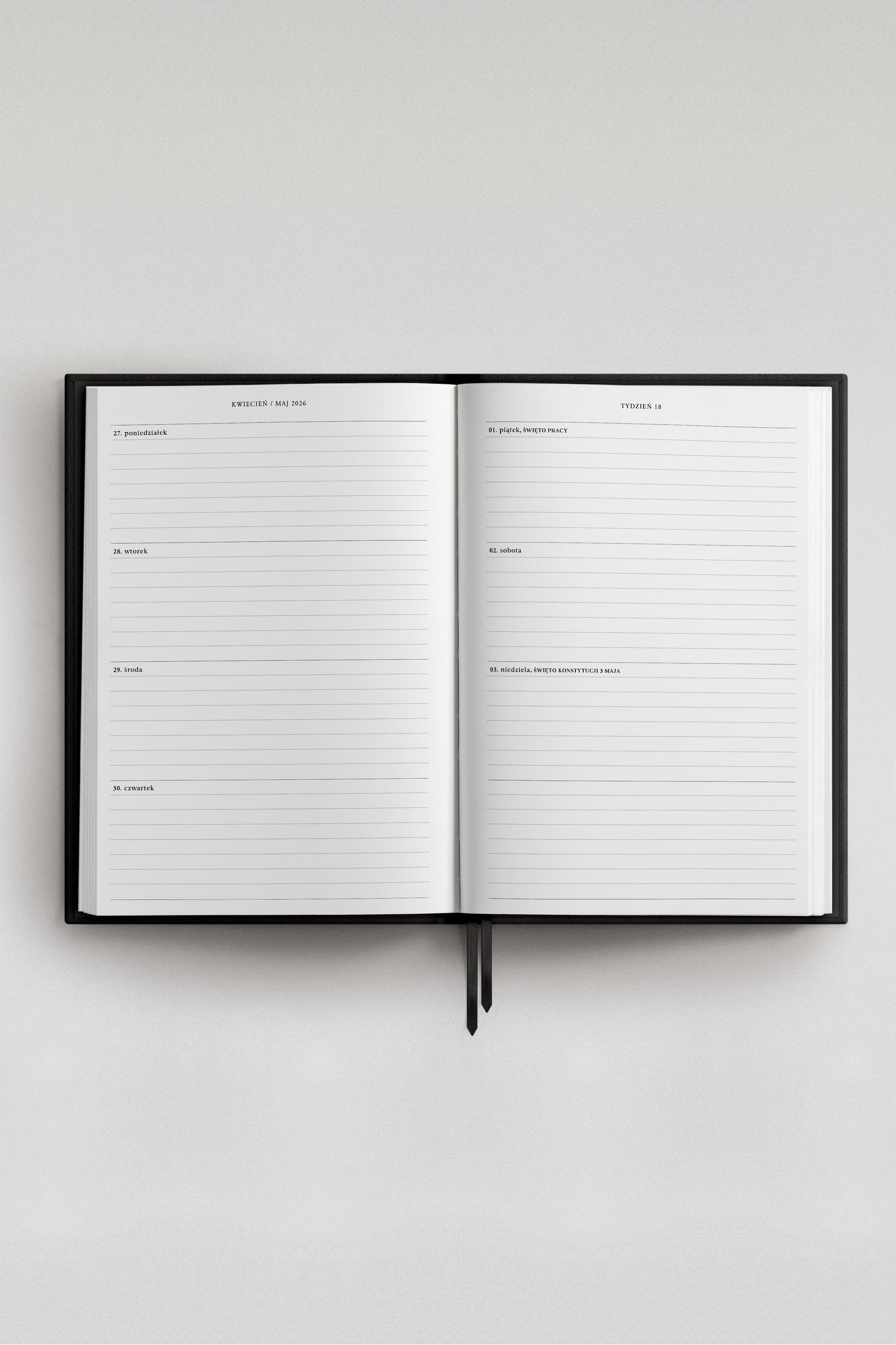 Każdy tydzień - od stycznia do grudnia 2026, rozpisany jest horyzontalnie z taką samą ilością miejsca na każdy dzień. Po lewej stronie dni od poniedziałku do czwartku, po prawej piątek, weekend i miejsce na notatki. Subtelny porządek, który nie narzuca formy, ale dyskretnie wspiera w organizacji.