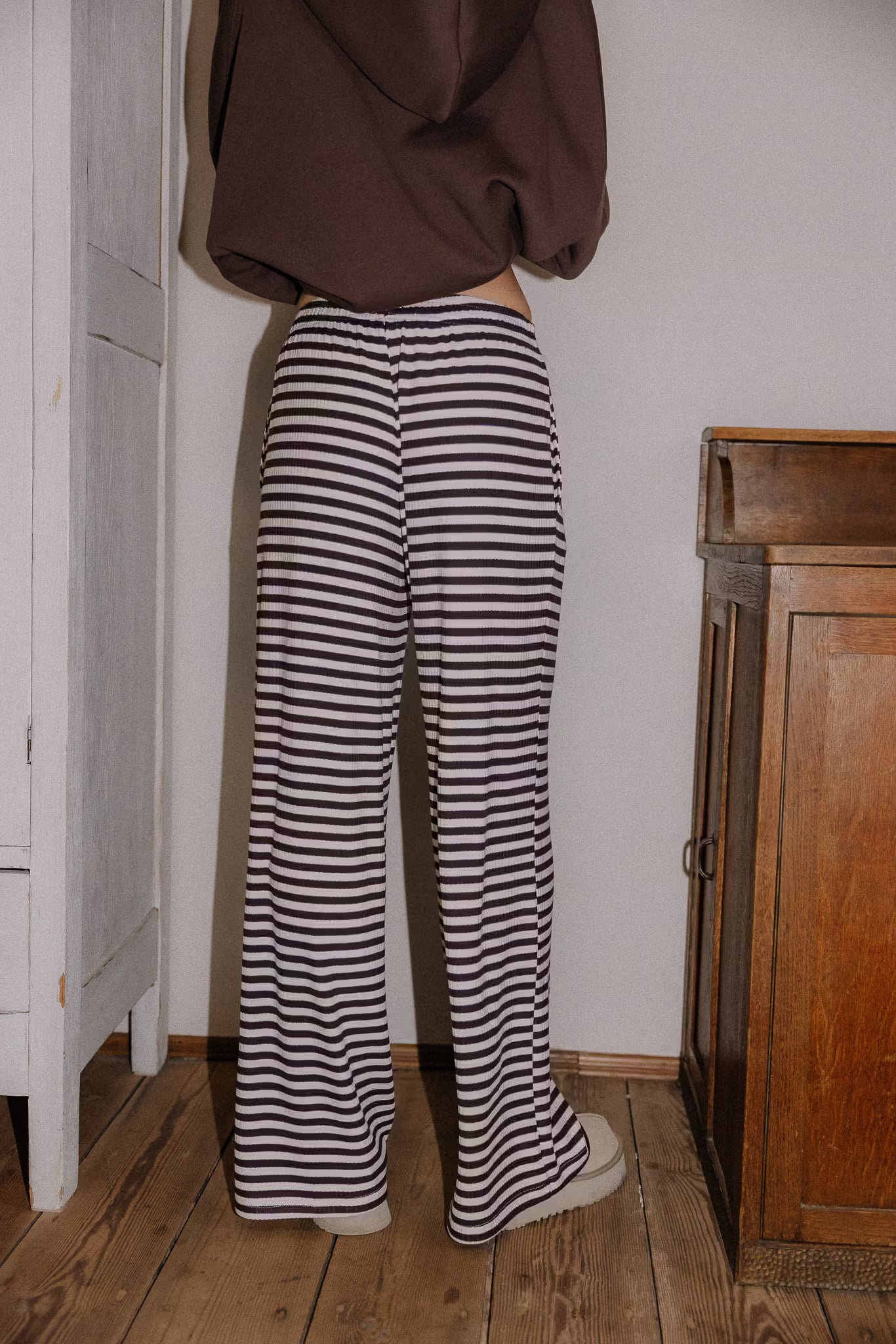 Długie, szerokie nogawki. Delikatna guma w pasie. Kieszenie w szwach bocznych. Prążkowany materiał.
