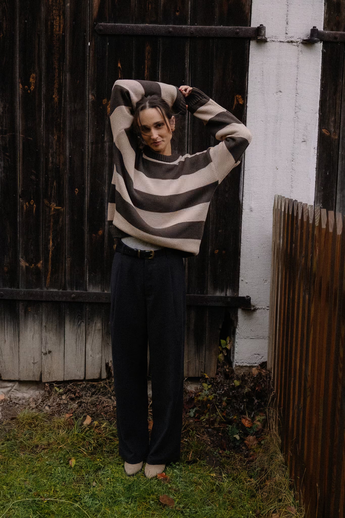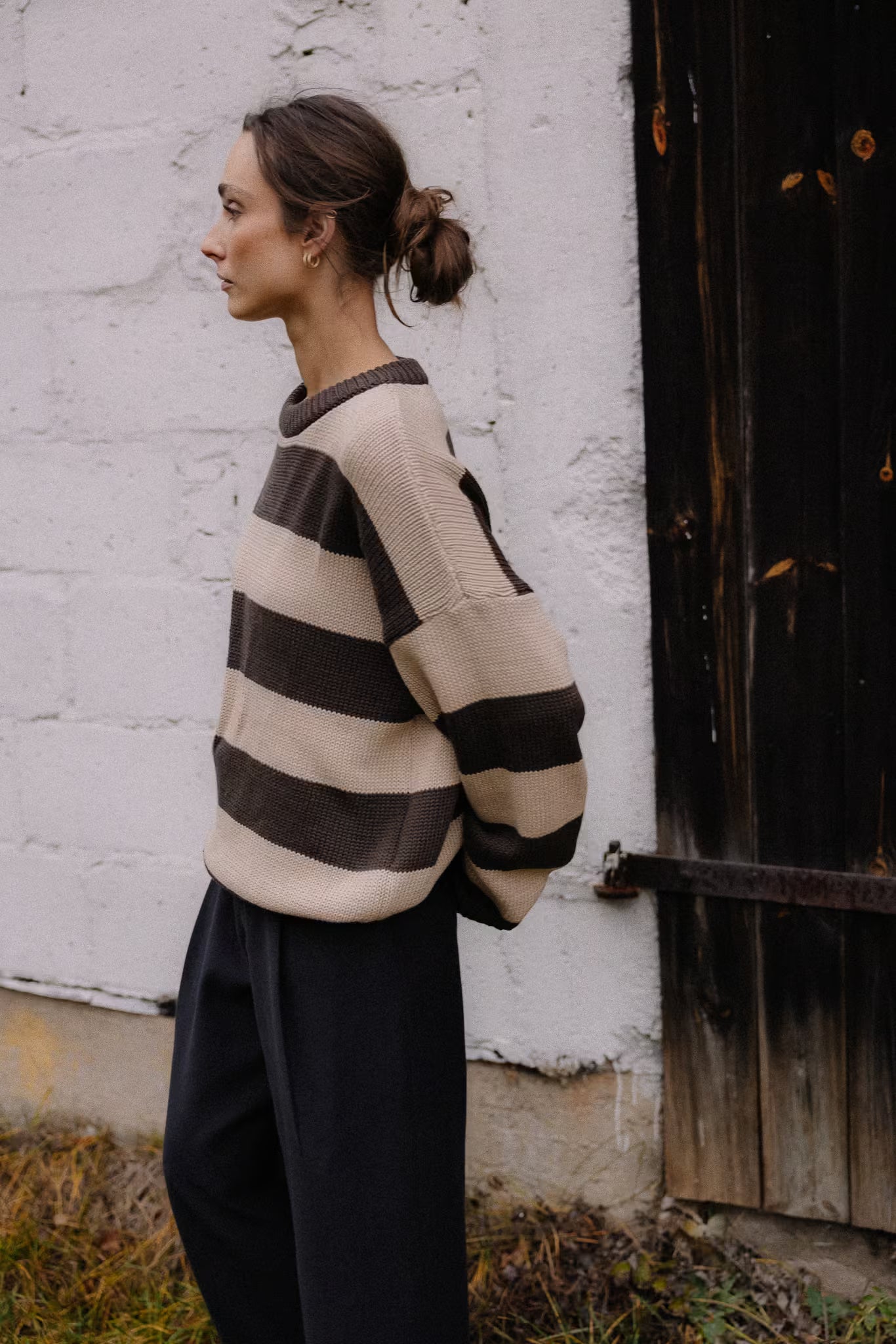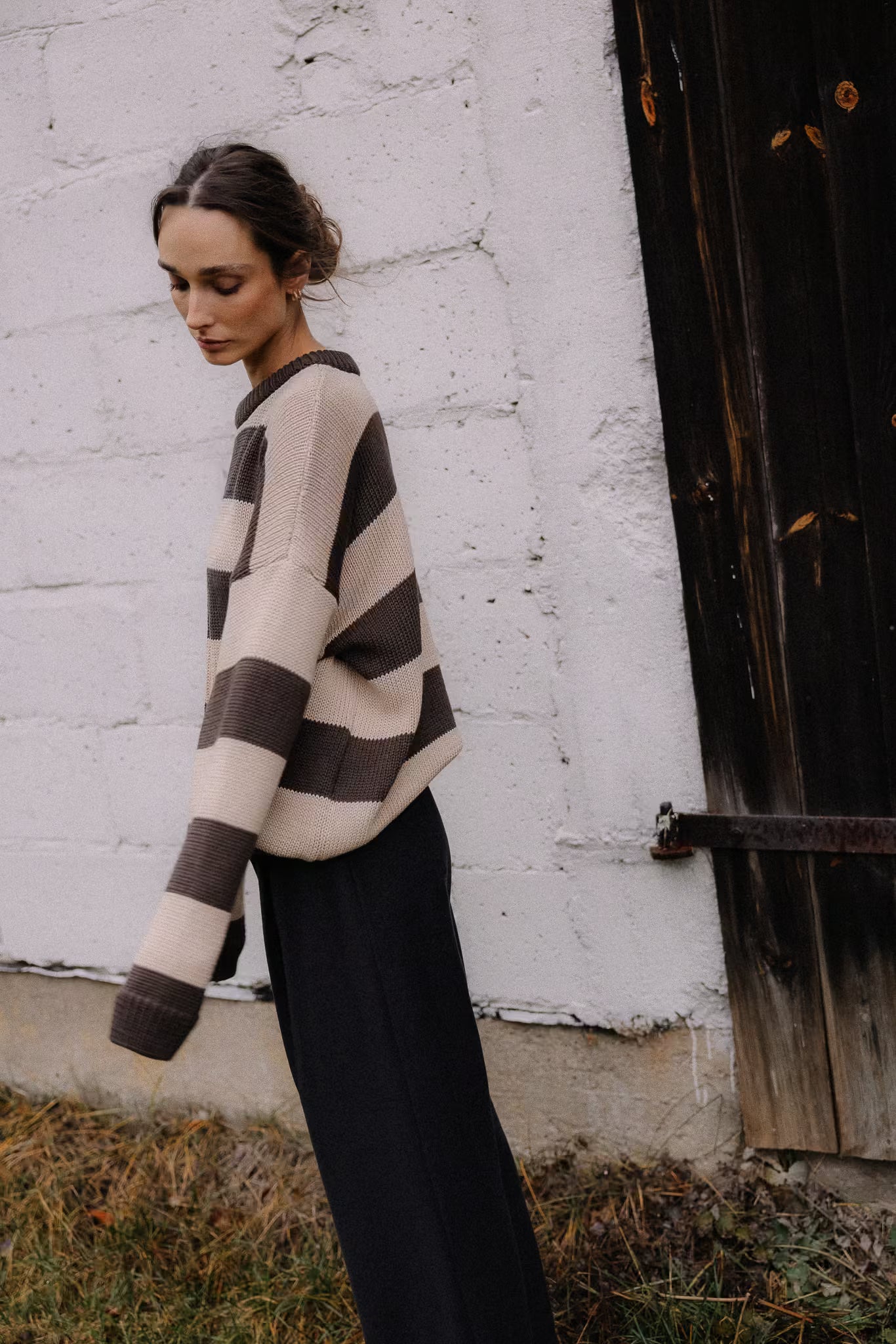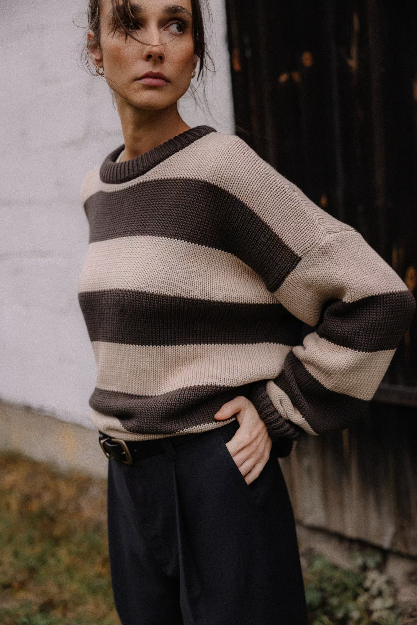 Krój oversize. Dekolt crewneck. Obniżona linia ramion. Dugie rękawy. Klasyczny splot.